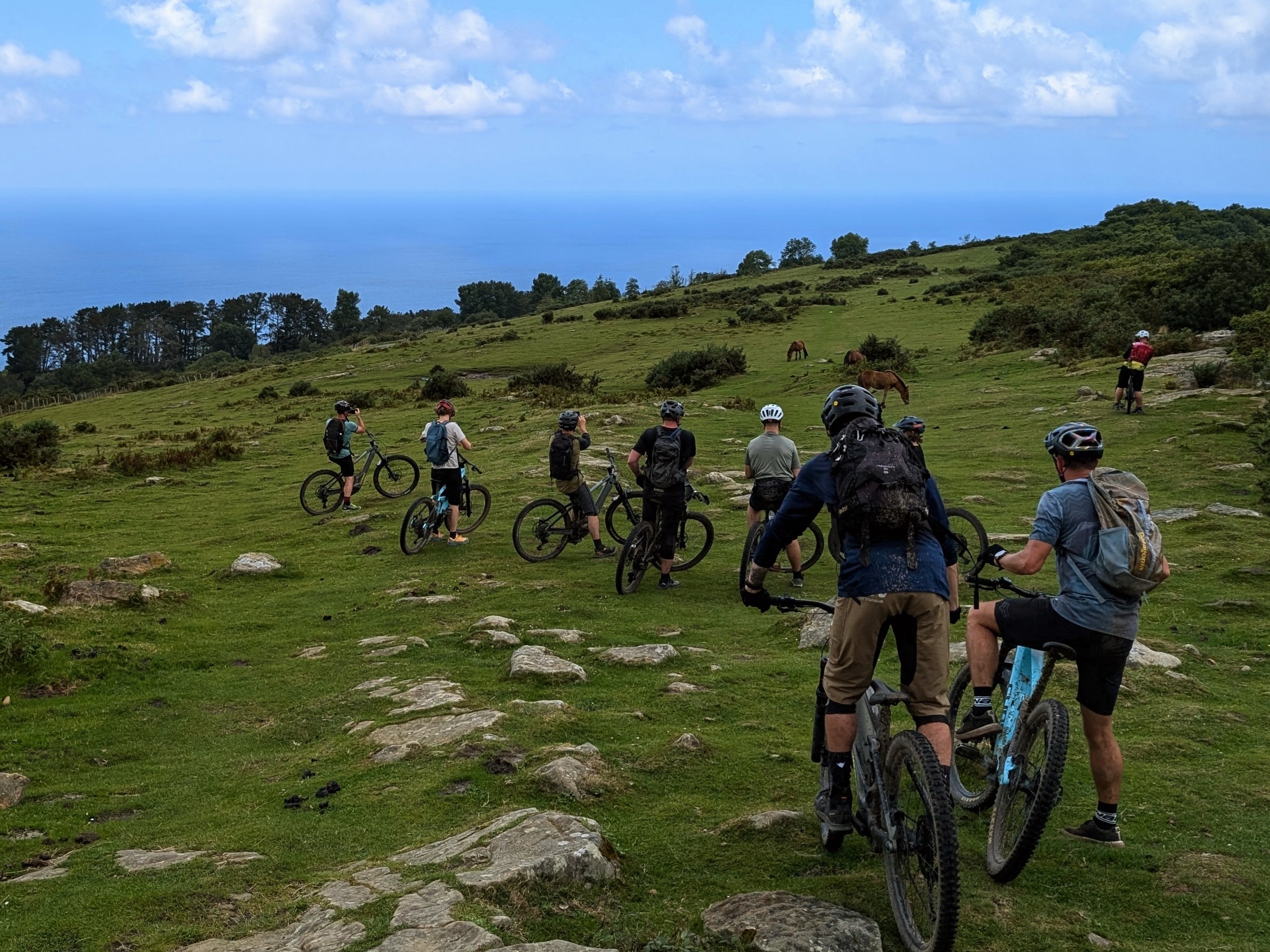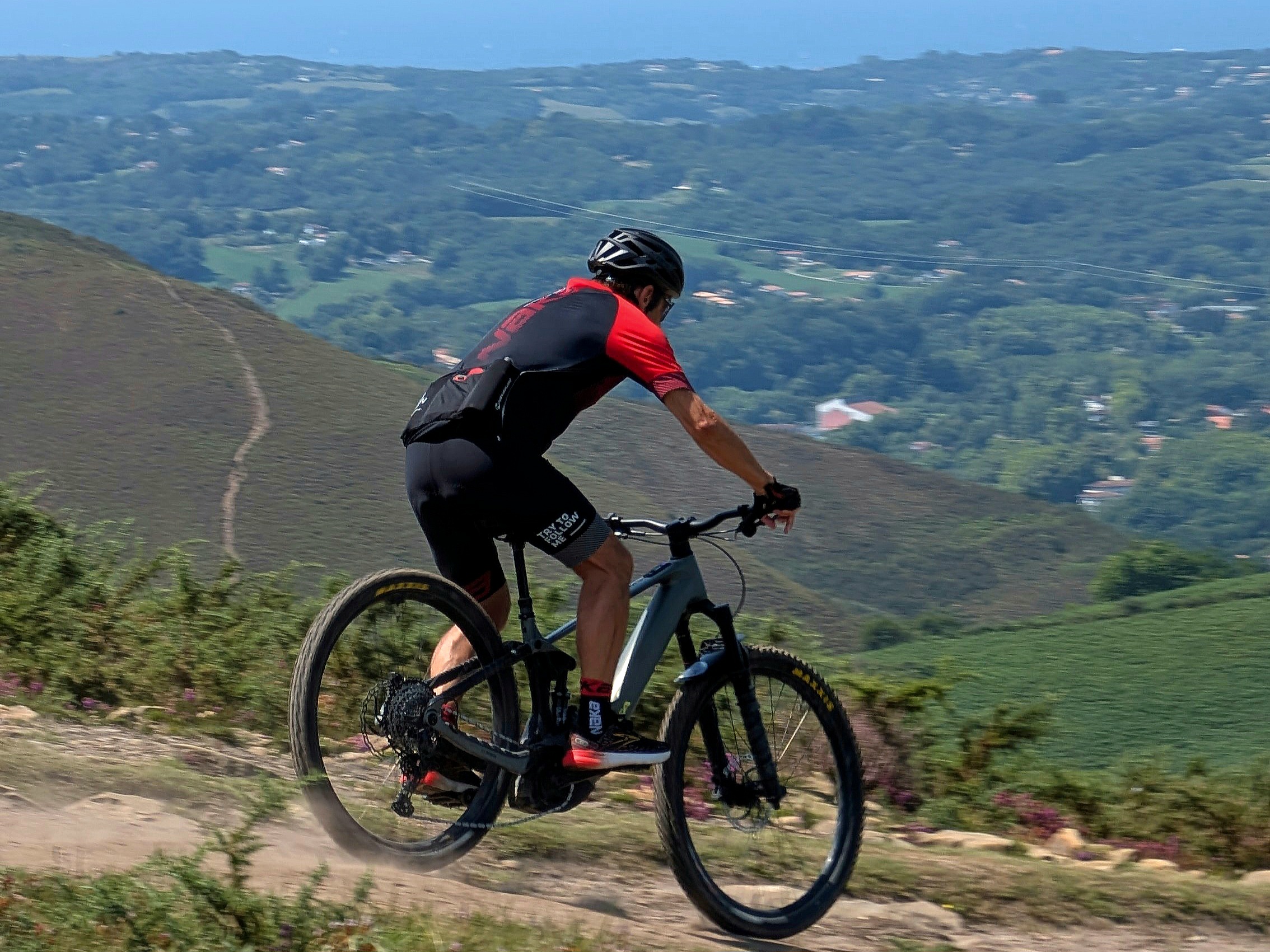 La première montée est assez raide mais grâce aux VTTAE, chacun trouve son rythme et profite pleinement du paysage. Là-haut, le panorama est saisissant : l’Atlantique d’un côté, la chaîne des Pyrénées de l’autre. Les vautours planent au-dessus des reliefs tandis qu’un beau sentier monotrace s’offre face à nous.